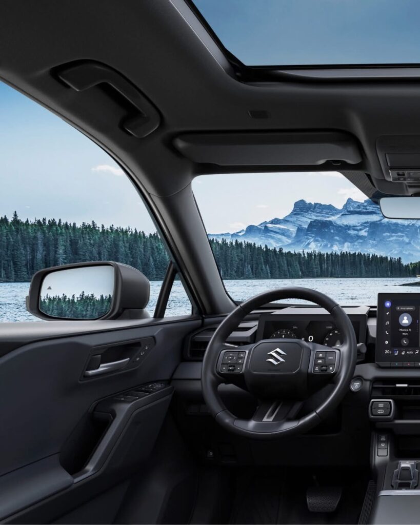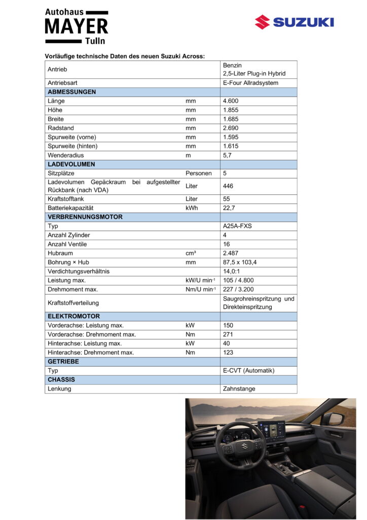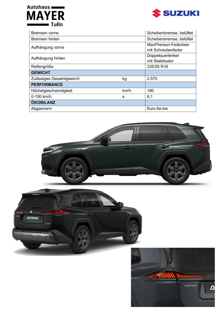 Schon auf den ersten Blick zeigt der neue Suzuki Across seine Stärke: Ein markanter Kühlergrill, eine kraftvolle Front und große Räder unterstreichen das selbstbewusste SUV‑Design. Robuste Radlaufleisten machen deutlich, dass der Across auch abseits befestigter Straßen eine gute Figur macht.